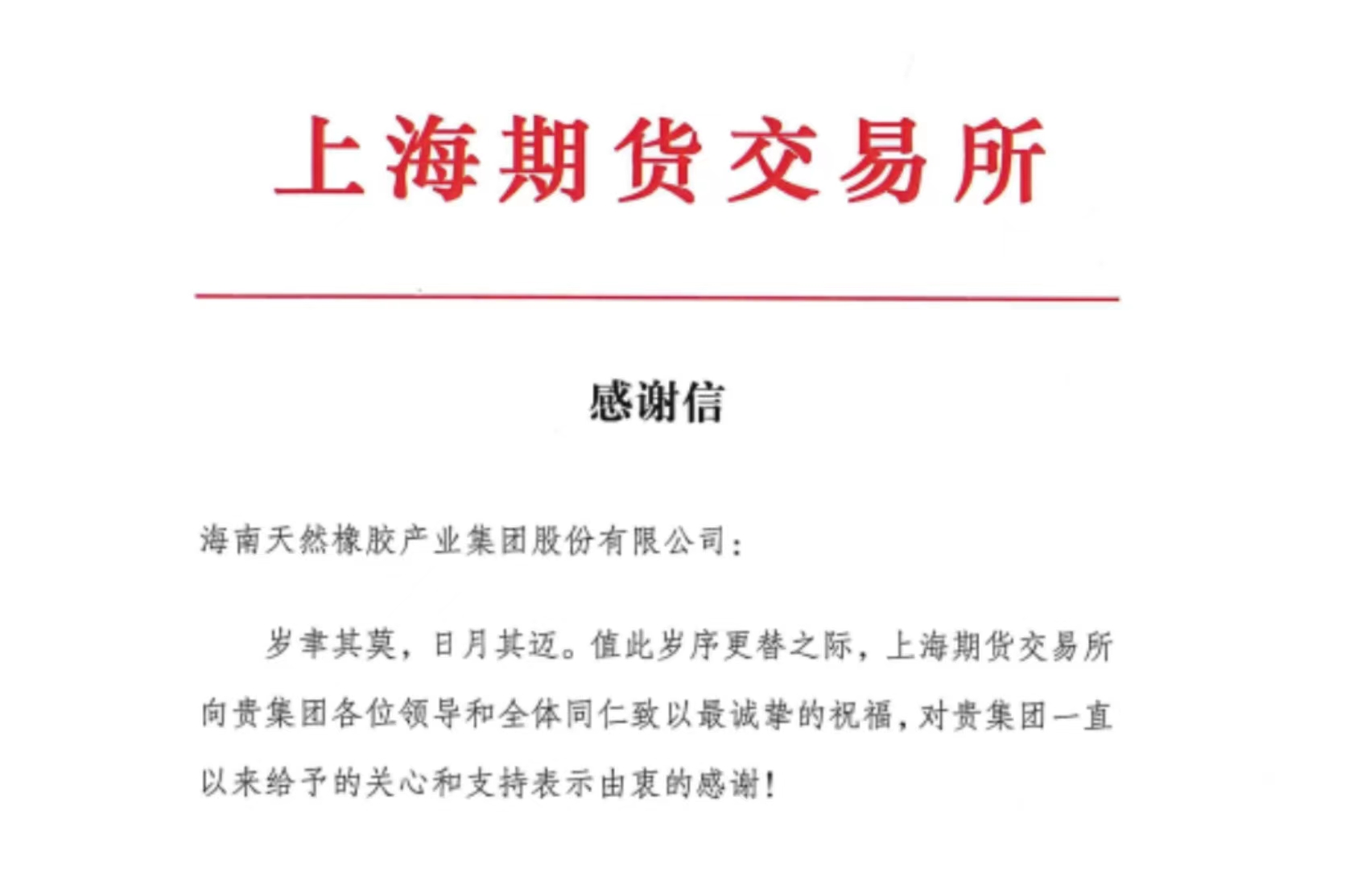 近日,海南橡胶收到一封来自上海期货交易所的感谢信,信中对海南橡胶在天然橡胶期货功能发挥、产融服务基地建设、20号胶期货“丰羽行动”、能源化工产品委员会工作等方面给予的高度重视和支持表示感谢。