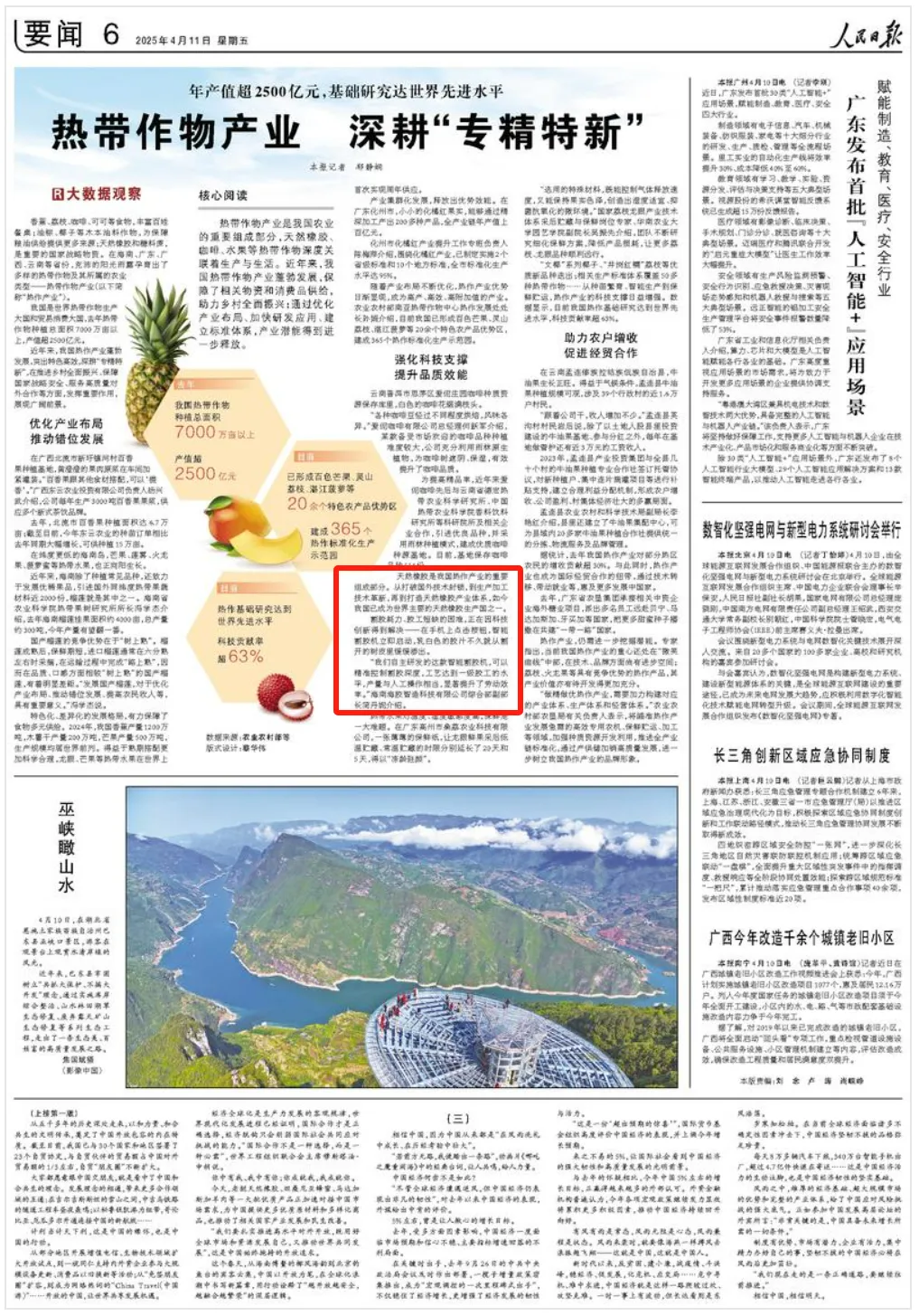 4月11日,《人民日报》要闻版刊发《热带作物产业 深耕“专精特新”》,重点提及海南橡胶的智能割胶机研发成果