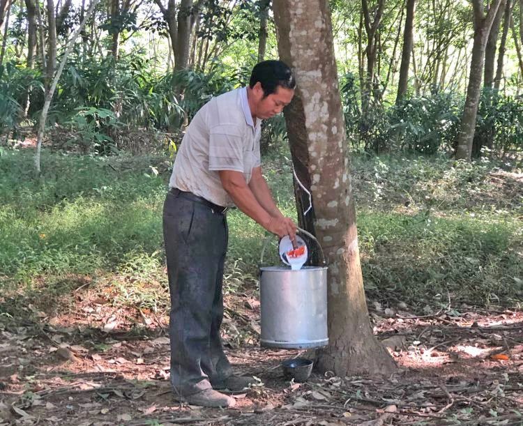 2005年,年仅19岁的温业国接过母亲承包的两千多株割胶岗位,拿起胶刀,开始了他的割胶生涯,到如今,已与橡胶打了18年的交道。